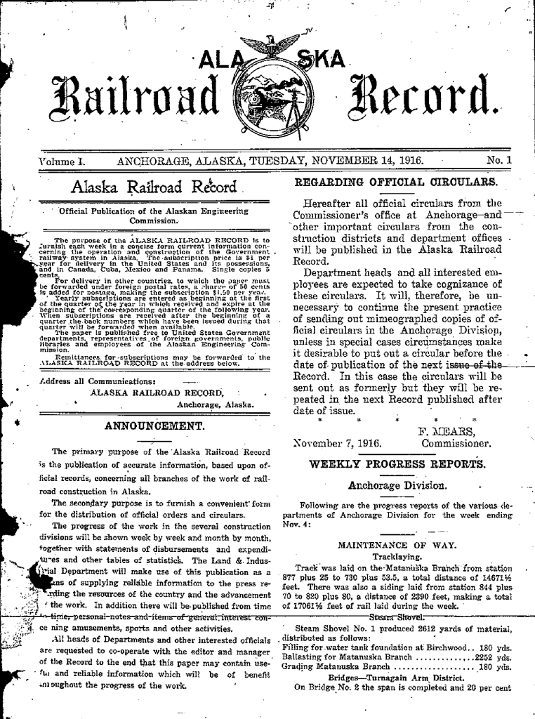 The Alaska Railroad Record was the official publication of the Alaskan Engineering Commission (AEC), providing a detailed weekly record of the construction of the Alaska Railroad, along with news, progress reports, schedules, personnel notes, and other material relevant to the federal railroad construction project between Seward and Fairbanks. It was published from November 14, 1916 to June 29, 1920. The eight-page first issue is reprinted in this issue.