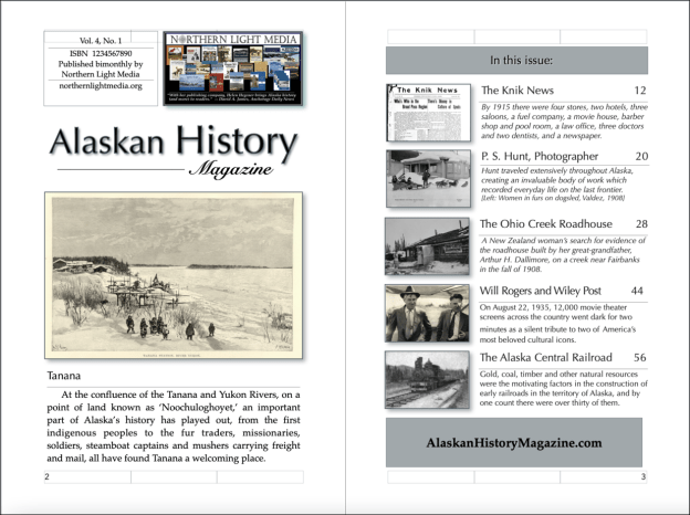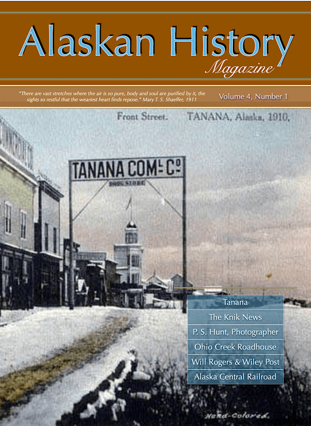 The first new issue of the revised Alaskan History Magazine will offer an assortment of articles on the history of the state, from the history of Tanana to The Knik News and pioneer photographer P. S. Hunt, to an article about a woman who came to Alaska seeking information about her great-grandfather and wrote a book about it, some of which is excerpted in Searching for the Ohio Creek Roadhouse. Other articles include an in-depth looks at the final days of Will Rogers and Wiley Post as they left Seattle and toured Alaska, and the history of the 72-mile Alaska Central Railroad, which was a forerunner of the current Alaska Railroad from Seward to Fairbanks. 64 pages, 6” x 9” format, B/W interior, postage paid.