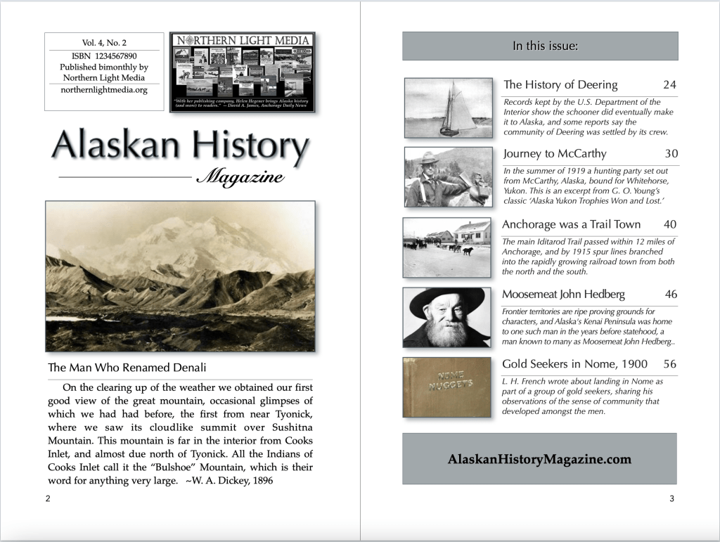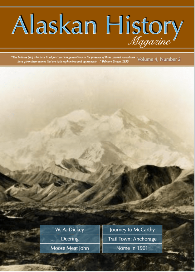 The second issue of Volume 4 of the new revised Alaskan History Magazine includes the story of W. A. Dickey, the man who renamed Denali in 1896. He wrote: “On the clearing up of the weather we obtained our first good view of the great mountain, occasional glimpses of which we had had before, the first from near Tyonick, where we saw its cloudlike summit over Sushitna Mountain. This mountain is far in the interior from Cooks Inlet, and almost due north of Tyonick. All the Indians of Cooks Inlet call it the ‘Bulshoe’ Mountain, which is their word for anything very large.”