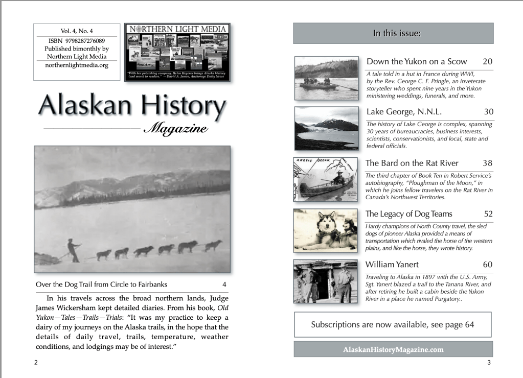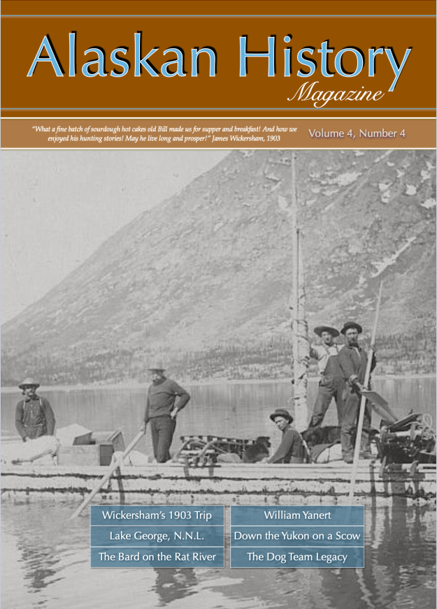 This issue features the writings of Alaska’s territorial judge for the 3rd District, James Wickersham, whose well-kept diaries provide an open window into life on the last frontier in the earliest years of its existence. Also in this issue: A tale told in a hut in France during WWI, by the Rev. George C. F. Pringle, an inveterate storyteller who spent nine years in the Yukon ministering weddings, funerals, and more; the history of the once self-dumping Lake George, now a National Natural Landscape; The third chapter of Book Ten in Robert Service’s autobiography, “Ploughman of the Moon,” in which he joins fellow travelers on the Rat River in Canada’s Northwest Territories; a tribute to the sled dogs of pioneer Alaska, hardy champions of North County travel; and the story of Sergeant William Yanert, U.S. Army 6th Cavalry, who explored the Chilkoot Trail before it was known by that name and blazed the first trail from the Nenana River near Denali north to the Tanana River.