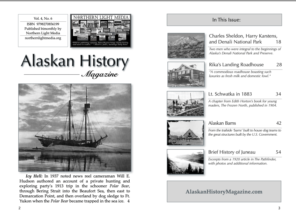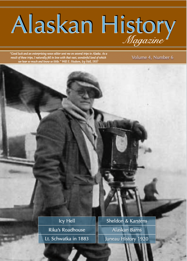 Featured in this issue of Alaskan History Magazine is an excerpt from Will Hudson’s classic 1937 book ‘Icy Hell,’ detailing the harrowing overland journey he and several others made across the Brooks Range to the village of Fort Yukon when their ship ‘Polar Bear’ was trapped in the polar ice pack in 1913. Hudson was the first still photographer on the staff of the Seattle Post-Intelligencer, and he had been invited to come along as the official cinematographer for the expedition. The trip proved to be far more adventurous than Hudson had bargained for.