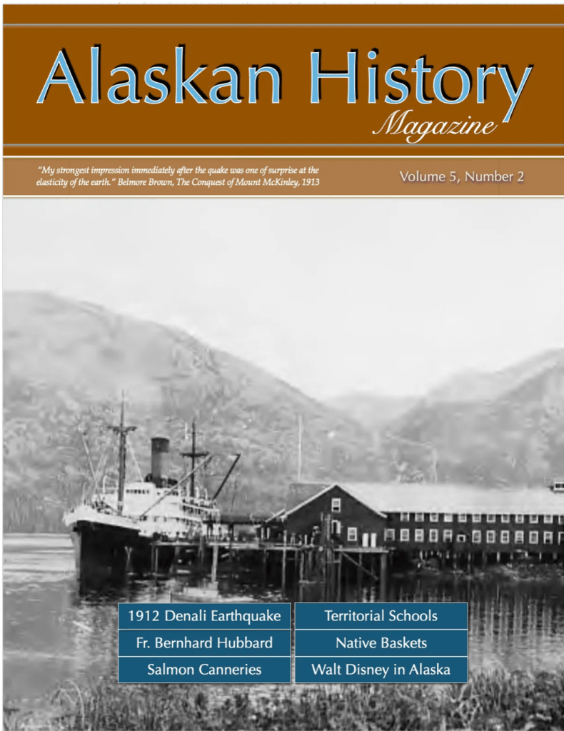 Volume 5, Number 2 features an article on the 1912 earthquake at Denali; Father Bernhard Hubbard, “The Glacier Priest;” a 1947 trip to the territory of Alaska by Walt Disney; plus salmon canneries, territorial schools; and Native basketry.